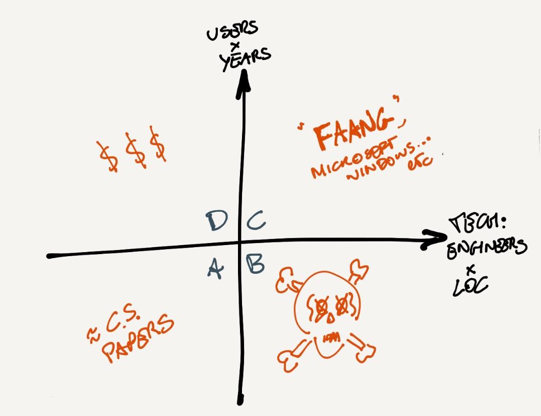 B - Large codebases/companies with few users. A.k.a. dead. This is what we want to avoid. Maybe once upon a time, you were in C, and fell down here...